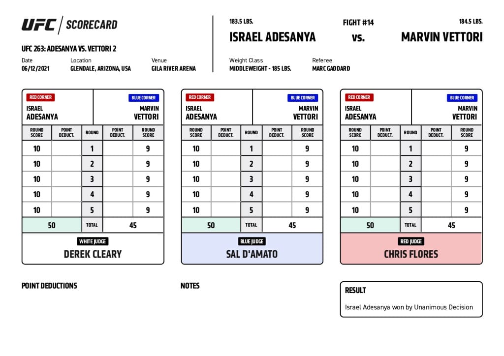 Israel Adesanya derrotou Marvin Vettori na decisão unânime dos juízes (50-45, 50-45, 50-45)