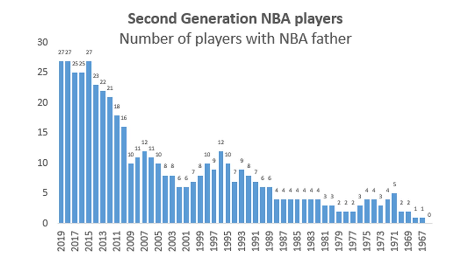 Não, brincadeira, o post é sobre outra coisa. Como filósofo de coisas inúteis que sou, pensei que não faltam jogadores na NBA atual que tiveram pais atuando na mesma liga. Pensei: put$%* mer$¨&U como vou fazer um texto desses sem fazer um levantamento ano a ano? Mas graças a Deus que os americanos fazem estatísticas até de quantas vezes meus leitores me abandonam no primeiro parágrafo. Se você ainda está aqui, obrigado.