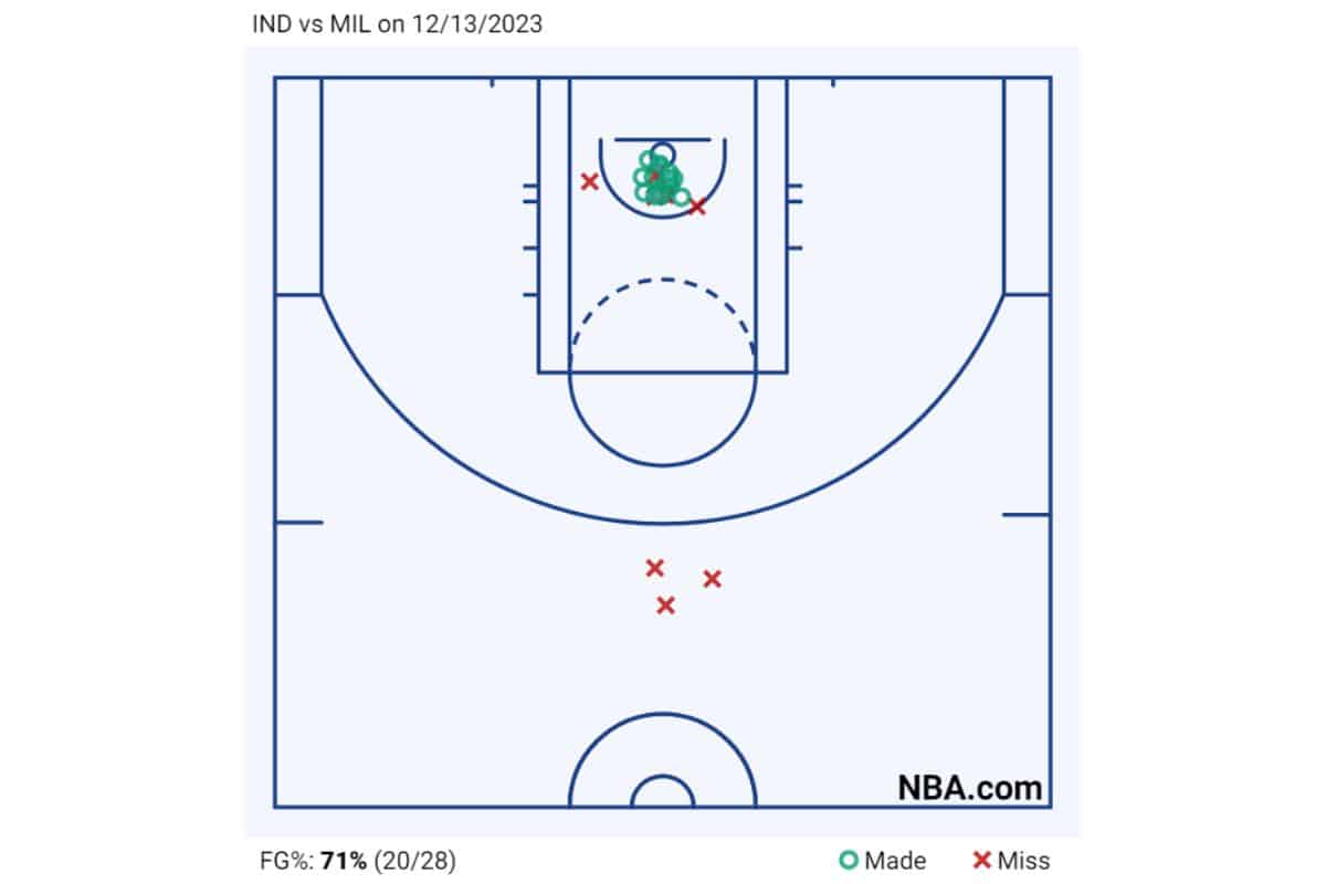 Contra os Pacers, Giannis jogou atacou o aro o tempo inteiro. Dos 28 arremessos que tentou, 24 foram próximos à cesta, e 20 foram convertidos. Aproveitamento de 83.3% em uma distância onde a média da liga fica na casa dos 65%. As outras tentativas foram uma da meia-distância e três do perímetro, toda erradas.