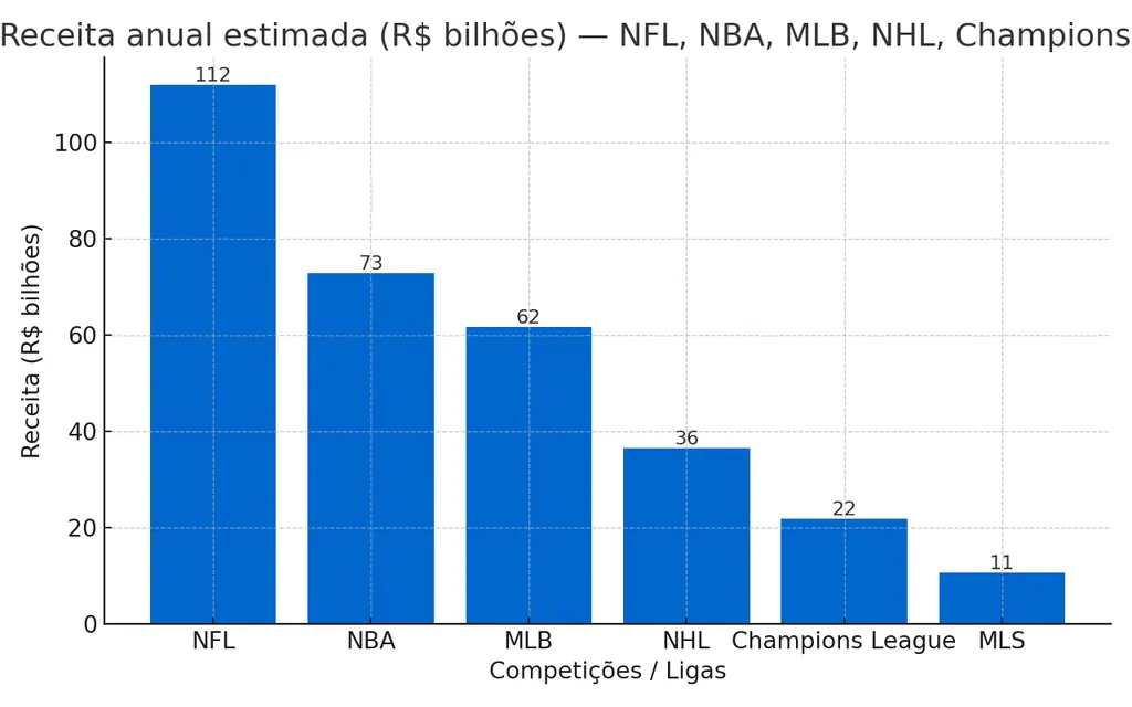A NFL sozinha gera mais receita em uma temporada do que toda a UEFA em três anos. A diferença é estrutural: enquanto o futebol europeu depende de performance esportiva, as ligas americanas constroem estabilidade financeira por meio de contratos de mídia e patrocínios centralizados.